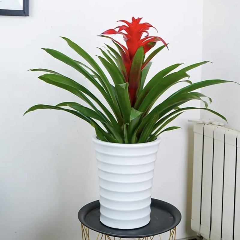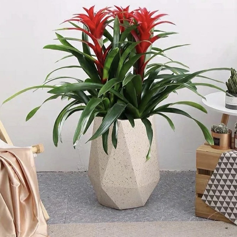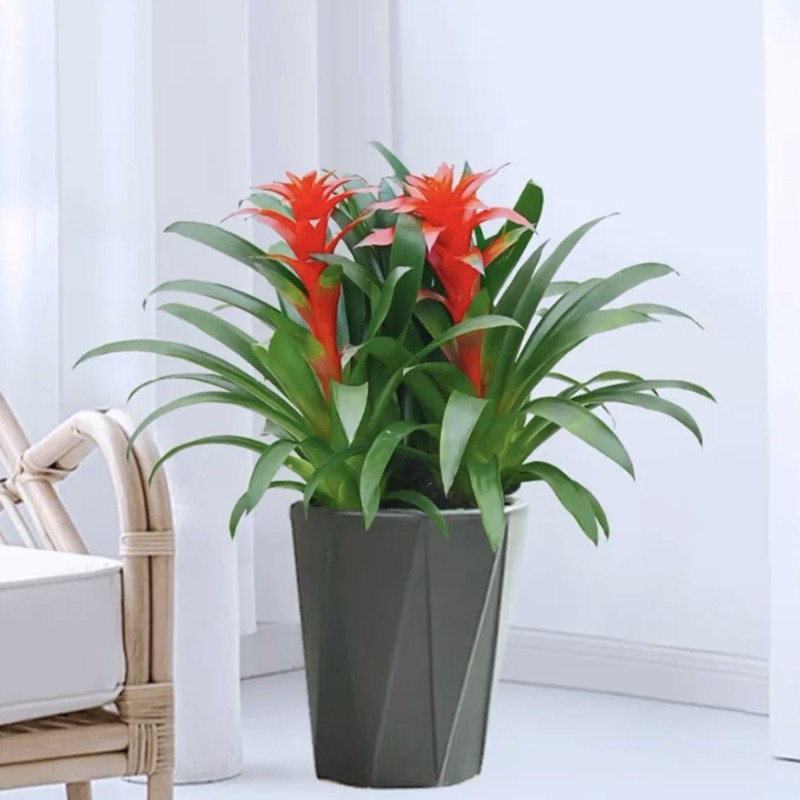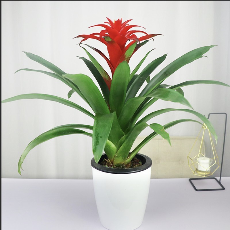 由三组植物构成,“鸿运当头” 通常指凤梨科植物,其花朵颜色鲜艳似火,摆放在室内能带来热闹喜庆的感觉,寓意好运来临。