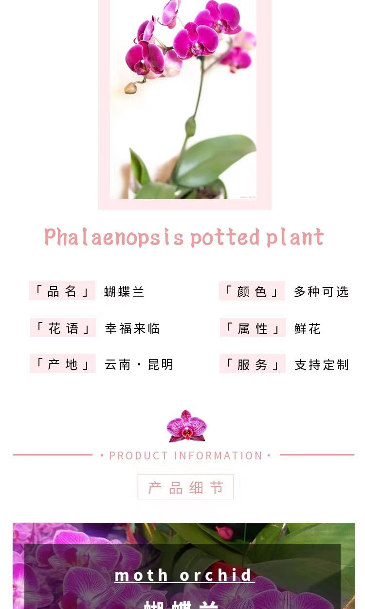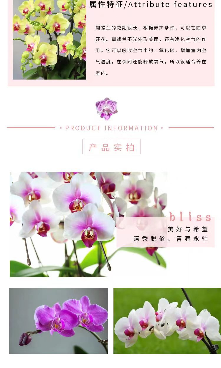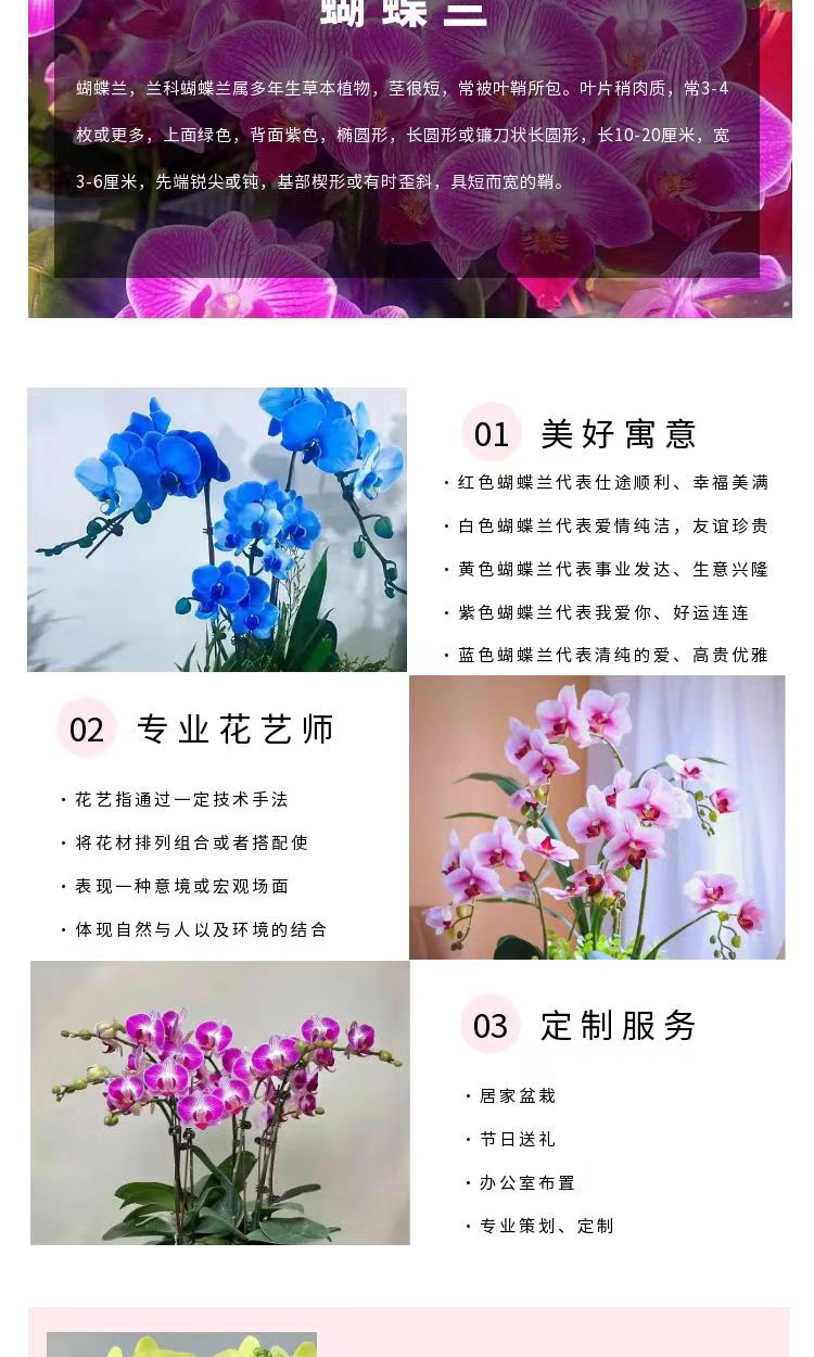 蝴蝶兰,兰科蝴蝶兰属附生性草本植物,因花朵形似振翅欲飞的蝴蝶而得名。其茎短,叶片肉质厚实,花葶从叶腋中抽出,花朵硕大且色彩丰富,常见有纯白、粉红、紫红等色系,花瓣质地如丝绸般细腻,花姿优雅动人。