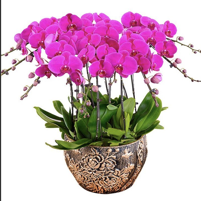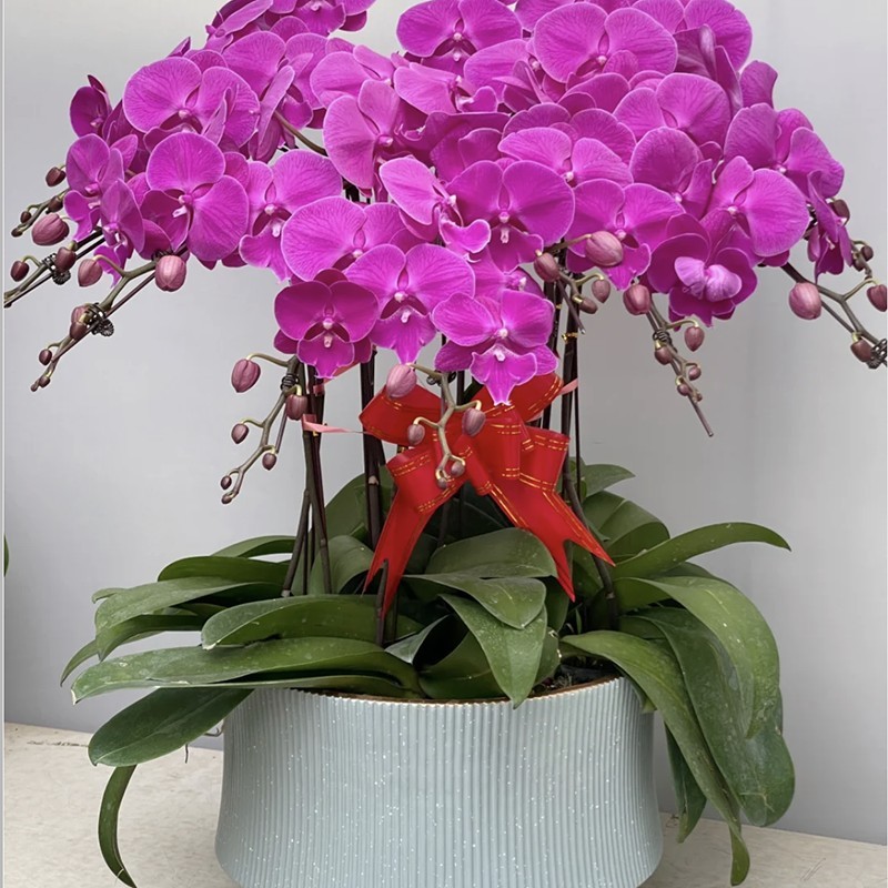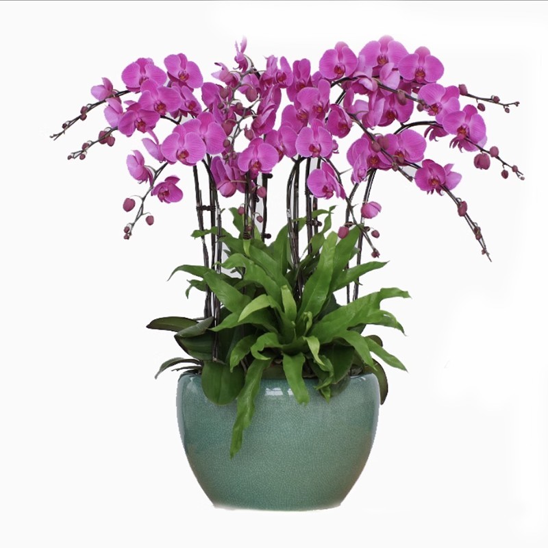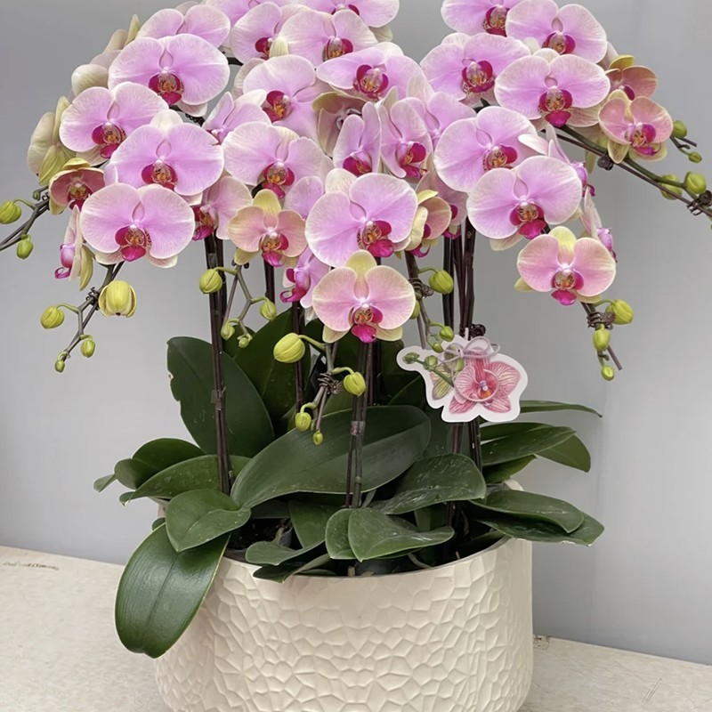 由多株蝴蝶兰搭配构成,蝴蝶兰花朵形状宛如翩翩起舞的蝴蝶,姿态优雅,颜色丰富多样,组合摆放后观赏价值很高,适合用于装饰、送礼等。